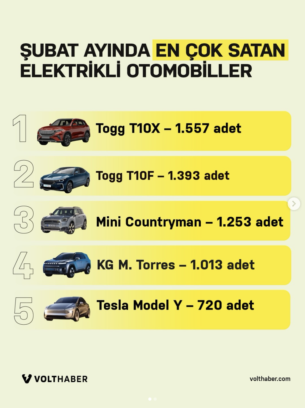 Türkiye’de elektrikli otomobil pazarı büyümeye devam ederken, Şubat ayında en çok satış yapan modeller belli…